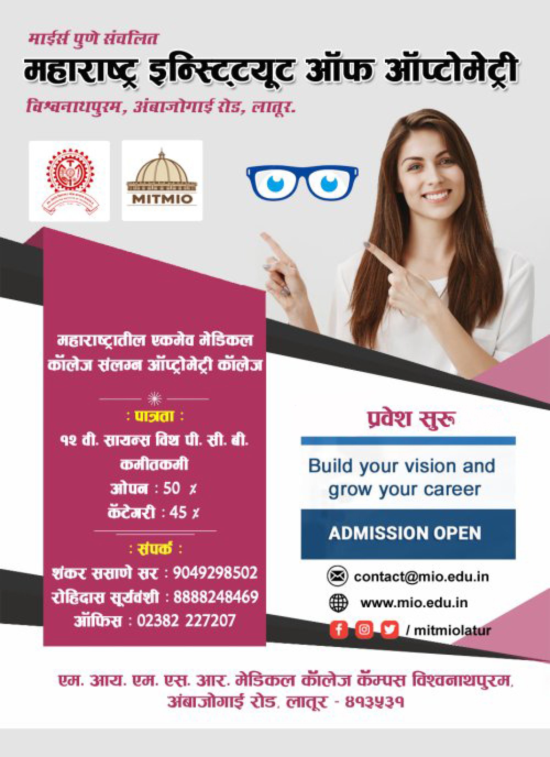 बारावी उत्तीर्ण विद्यार्थ्यांना महाराष्ट्र इन्स्टिट्युट  ऑफ ऑप्टोमेट्री महाविद्यालयात नेत्र तंत्रज्ञ होण्याची संधी - बी. एस्सी. ऑप्टोमेट्री पदवी अभ्यासक्रमास लातूरात मिळणार प्रवेश